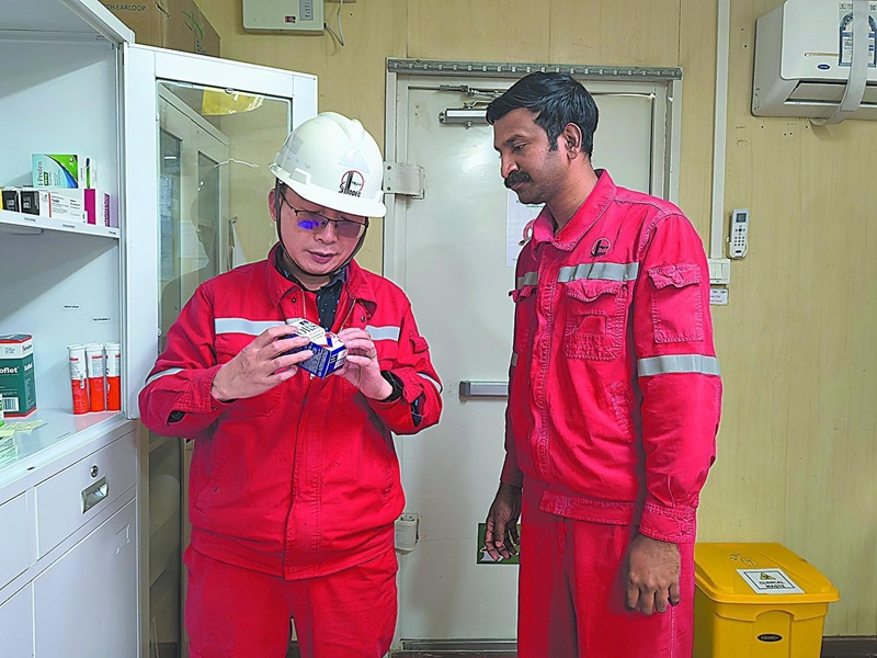 为了让来自不同国家的外籍员工更好地融入团队,项目部坚持以尊重为本,关爱员工身心健康。所有队伍都配有外籍专职医生,并配备常用药品和急救设备,为员工提供24小时的日常健康咨询、紧急医疗处置和职业健康检测服务。他们每周还在营地组织“健康巡诊日”,由专职医生为员工测量血压、血糖,评估体检数据并提出饮食与作息建议。印度籍医生纳吉布曾在巡诊中发现一名钻工有中暑征兆,他第一时间采取降温与补液措施,缓解了这名员工的不适。此外,项目部还定期开展“健康小课堂”,培训常见急救知识、高温应对方法,帮助员工增强健康意识、筑牢健康防线。