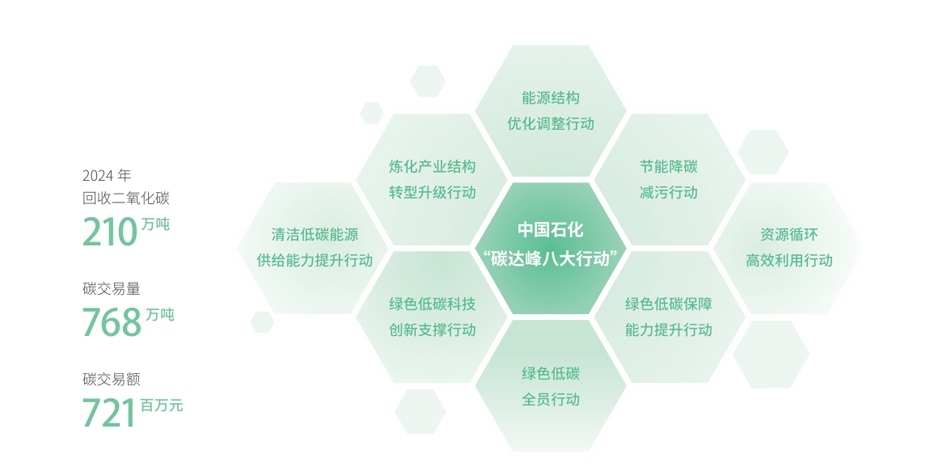 中国石化深入推进“能效提升”计划,稳步实施“碳达峰八大行动”,狠抓温室气体源头减排、过程管控和末端治理,积极推进二氧化碳回收和资源化利用,持续推进化石能源洁净化、洁净能源规模化、生产过程低碳化,助力实现碳达峰碳中和目标。