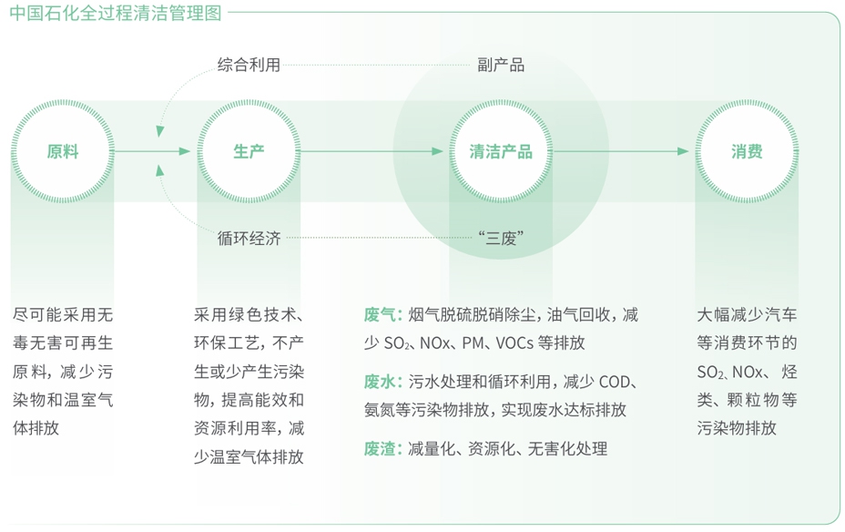 中国石化深入推进绿色企业行动计划,坚持减污降碳协同增效,持续实施清洁生产,积极推进节能减排工作,大力发展循环经济,加快打造全产业链、全工艺链、全管理链的绿色发展模式,有效锻造绿色