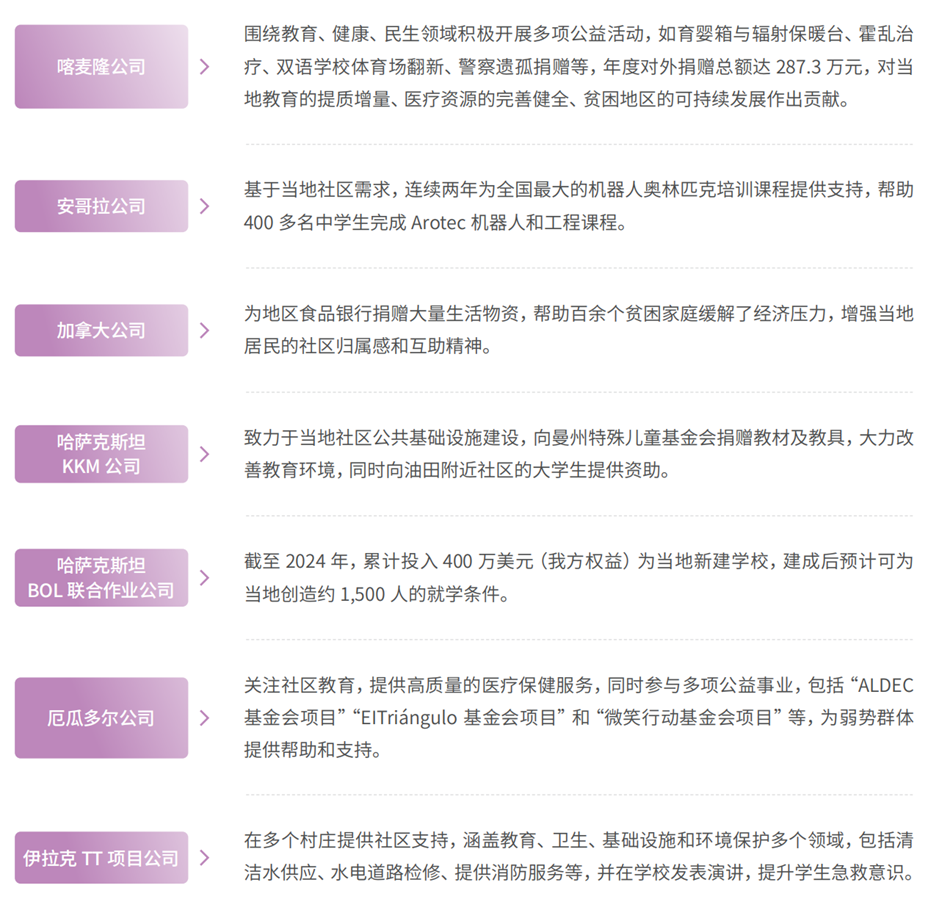 中国石化以“全球布局、属地深耕”为基点,精准聚焦教育支持、医疗援助等核心领域,构建系统化、全链条的社会责任履行体系,推动优质资源共享,促进社会福祉提升。关注困难弱势群体,积极支持和援助项目所在地居民,鼓励员工投身社区志愿服务,携手共建和谐美好家园。搭建文化交流平台,推动不同国家和地区间的互信共融,携手全球伙伴共创繁荣、共享未来。