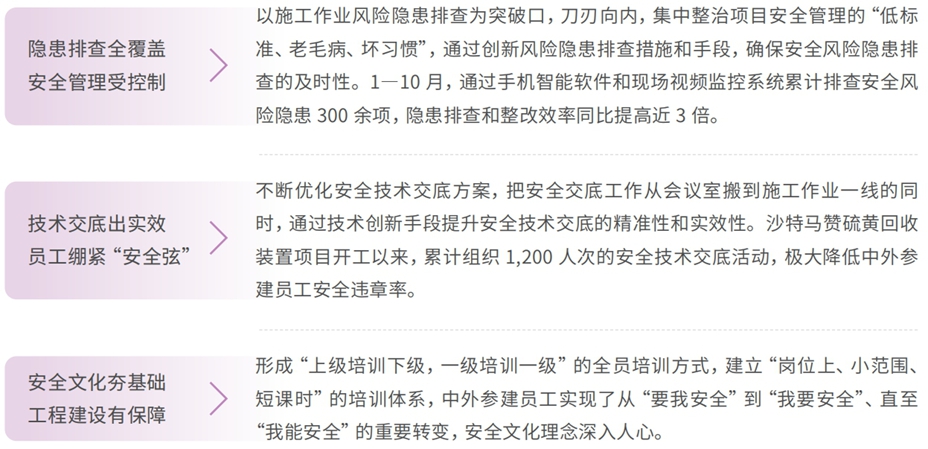 2024年第四季度,沙特马赞硫黄回收装置项目进入工艺管道、设备安装、电气仪表等专业施工冲刺阶段,起重吊装、高处作业,工程建设面临严峻的安全管控形势。中国石化十建公司聚焦施工作业一线,通过实施全方位风险隐患排查、持续推动安全技术交底创新、积极营造安全文化氛围的管理模式,筑牢项目建设安全管控防线,为实现全年海外工程项目攻坚创效目标保驾护航。
