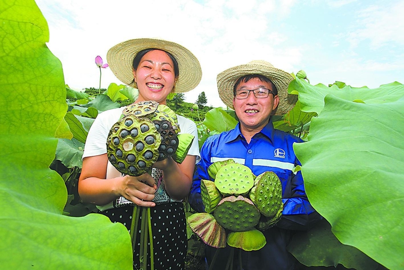 销售华中驻湖北红安县张石河村工作队队长陈湘(右)与该村村民陈红燕共同采摘莲蓬。魏昊星 摄