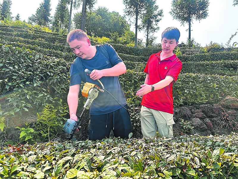 西南石油局驻四川沐川县白凤村工作队队员邵忠威(右)指导该村茶农唐科富修剪控梢,促进茶叶增产。黎 丁 摄