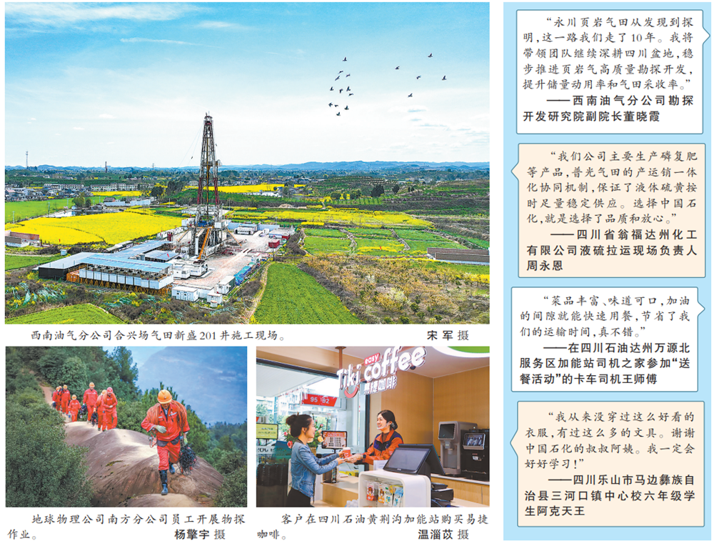 巴山蜀水,沃土藏金。“十四五”以来,中国石化驻川企业秉持“在川兴川、赋能兴川”理念,积极服务推动党中央决策部署在四川落地生根、开花结果,扎实做好能源保障、科技创新、绿色发展、服务民生等各项工作,累计探明天然气储量7077亿立方米,生产天然气800亿立方米,供应成品油2288万吨,缴纳税费超200亿元,投入乡村振兴帮扶资金超1.3亿元,助力谱写中国式现代化四川新篇章。
