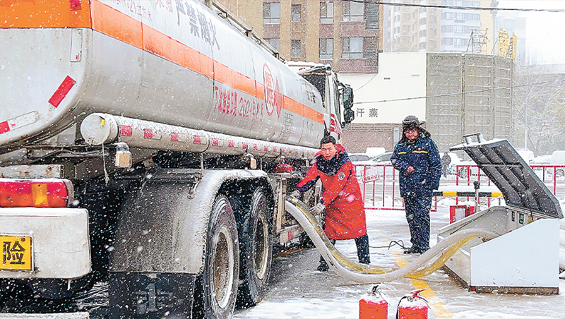 辽宁石油及时优化油品调度与配送,更换冬季低凝点油品,部分站点延长营业时间,全力保障冬季加油需求。同时,强化接卸油管理,从源头把控油品数质量。图为1月10日辽宁沈阳石油长青南街加能站员工在风雪中接卸油品。吴 迪 摄 王 晶 文