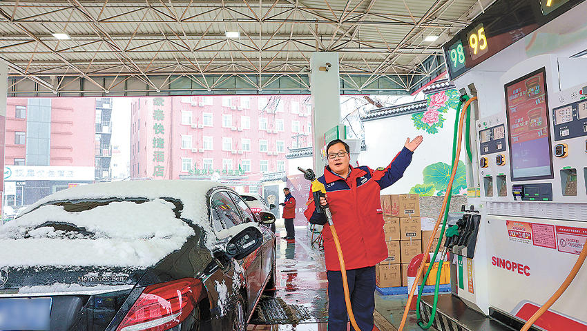 安徽石油提前调拨资源,严格落实冬防措施,及时排查设备情况、清扫积雪,为应急抢险、民生配送等车辆开辟绿色通道。图为1月20日合肥石油芜湖路加能站员工为客户加油。 孙德荣 摄