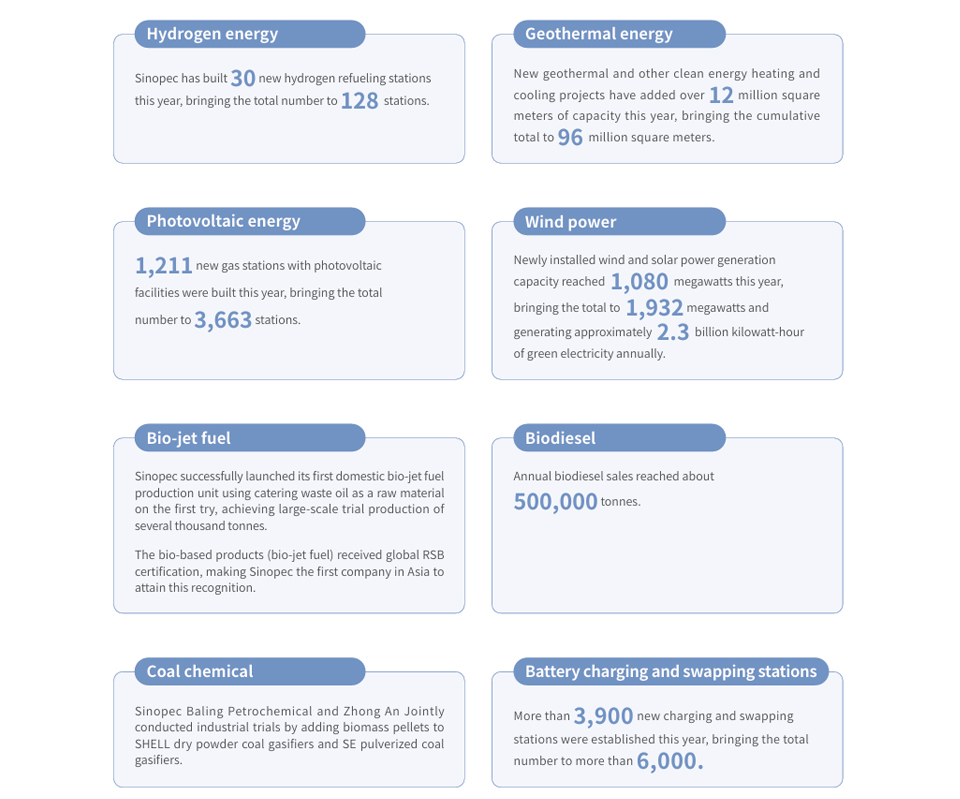 Sinopec has built a clean and low-carbon energy supply system covering various energy sources. The Company is actively developing emerging sectors such as hydrogen energy and rapidly advancing clean energy projects in geothermal energy, photovoltaics, and wind power. It is also exploring low-carbon energy services, including biofuels and charging and swapping solutions. In addition, Sinopec has made continuous breakthroughs in strategic new technologies, such as modern coal chemistry, and accelerated the development of integrated energy stations that offer oil, gas, hydrogen, and electricity services. These efforts are driving the low-carbon and green transformation of the energy sector and contributing to the rapid establishment of a new energy system.