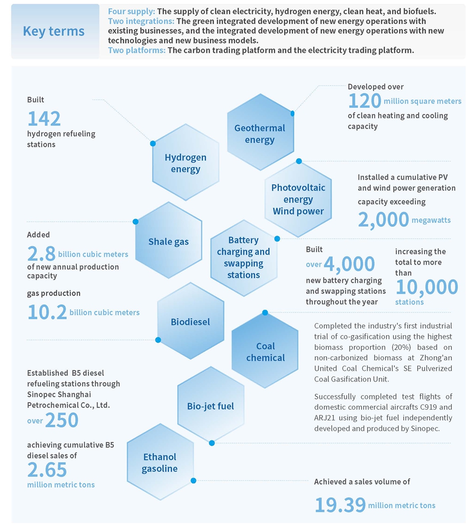 Sinopec remains committed to fully implementing its green and clean development strategy, promoting the coordinated advancement of geothermal, PV, wind, and other new energy sources. It has also explored opportunities in shale gas, bioenergy, and other clean energy fields, strengthened its capabilities in the "four supply" of renewable energy, and driven the integrated development of the "two integrations" across the industry chain. At the same time, the Company has expanded into two high-potential sectors—green power and hydrogen, and battery technologies— establishing "two platforms" and working to build a multi-energy, complementary, coordinated, and efficient energy system to support a clean, diverse, and secure energy supply.