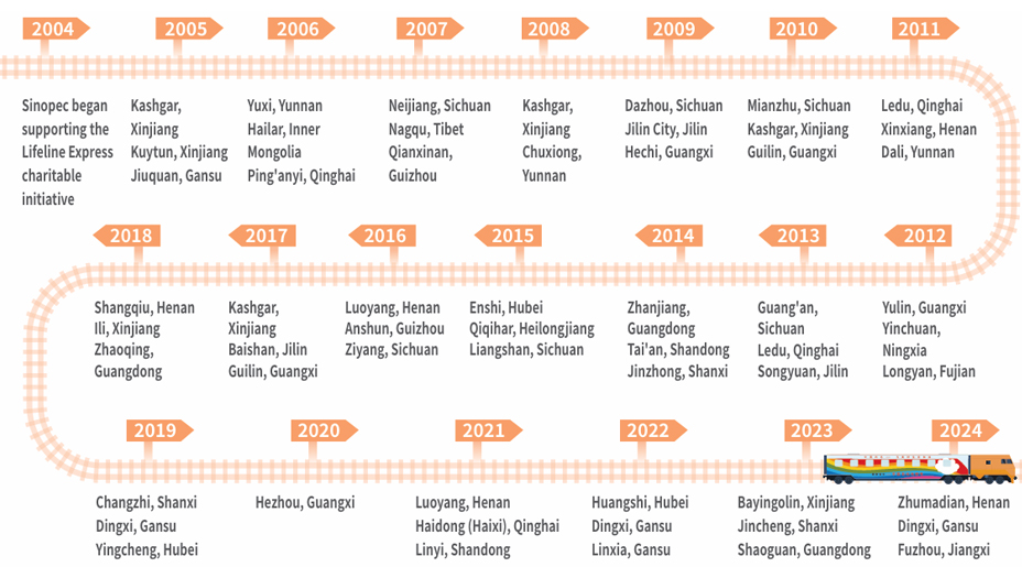 Since 2004, Sinopec has been a committed supporter of the Lifeline Express charitable initiative. In 2007, the Company contributed CNY 30 million to build the Sinopec Lifeline Express—the first and only train funded by an enterprise from the Chinese mainland and dedicated exclusively to charitable ophthalmic services. which has since been recognized as a key national project for blindness prevention and treatment. Every year, the Sinopec Lifeline Express travels to three regions across China, staying three months at each site and performing an average of 3,000 free surgeries. Its medical team consists of leading Chinese ophthalmologists renowned for their expertise. Upon arrival, they also provide hands-on training to local healthcare professionals, enhancing local hospitals' ophthalmic capabilities in diagnosis, surgery, and treatment.