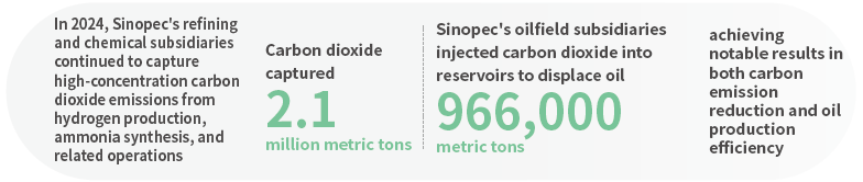 Sinopec has intensified its efforts in developing CCUS technologies and has deepened international cooperation and exchange to accelerate technological innovation and industrial deployment. The Qilu-Shengli Oilfield Million-Ton CCUS Project has received official recognition at the Carbon Sequestration Leadership Forum (CSLF) held in Warsaw, Poland, marking that Sinopec's CCUS technology has reached international standards and is eligible for global implementation. Sinopec has also showcased its full-chain CCUS demonstration achievements at the United Nations Climate Change Conference. In addition, the Company has launched China's first open-access 10-million-metric-ton CCUS initiative in East China in partnership with Shell, China Baowu, and BASF, and jointly initiated the establishment of the International CCUS Technology Innovation Cooperation Organization with the Chemical Industry and Engineering Society of China, China Huaneng, and Saudi Aramco. Sinopec subsidiaries have also actively promoted CCUS initiatives by leveraging their integrated resource and operational advantages. Sinopec Jinling Company, for example, has partnered with Jiangsu Oilfield to carry out carbon capture and oil displacement efforts, utilizing approximately 78,000 metric tons of captured carbon dioxide for oil recovery as of the end of 2024. A clear, new path that supports both carbon reduction and storage is emerging, and a new business model is taking shape, turning emissions into value, increasing oil production, and reducing carbon emissions.