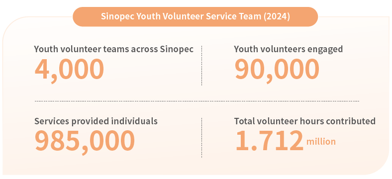 Upholding the spirit of volunteers featuring contribution, friendship, mutual support, and progress, Sinopec has issued the Notice on Further Strengthening and Standardizing Youth Volunteer Services, fostering the development of youth volunteer organizations, operational systems, and brand recognition. The Company has actively organized volunteer initiatives in areas such as elderly care, support for vulnerable groups, agricultural and farmer assistance, ecological protection, and science education, striving to enhance public well-being through concrete actions.