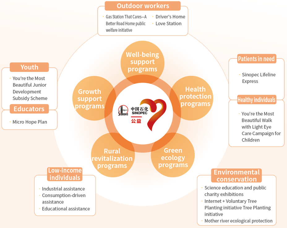 Sinopec remains committed to proactively fulfilling its responsibility, placing public well-being at the heart of its mission, and establishing its signature initiative, the "You're the Most Beautiful", which supports outdoor workers, youth, educators, patients in need, healthy individuals, low-income individuals, and other vulnerable groups, while also promoting environmental protection. Under this framework, Sinopec has launched five innovative public welfare programs centered on rural revitalization, well-being support, growth support, health protection, and green ecology. These initiatives reflect the Company's strong sense of responsibility and commitment to its founding values, turning its commitment to society into practical efforts that continuously improve quality of life for all.