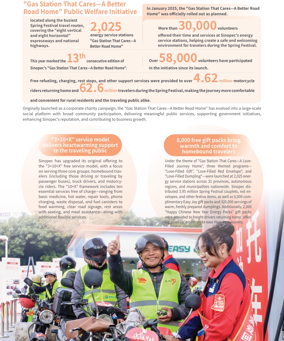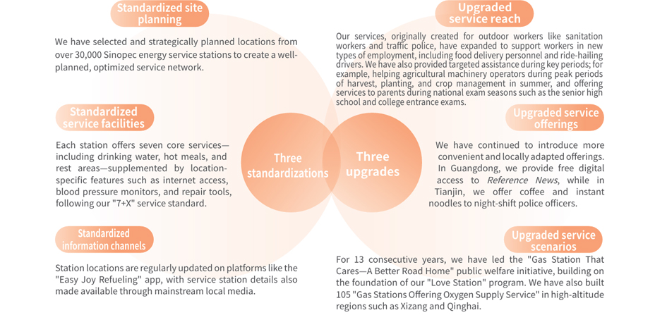 Leveraging its energy service station network, Sinopec has focused on supporting the needs of outdoor workers, including sanitation workers, food delivery personnel, couriers, taxi drivers, and truck drivers. The Company has actively promoted the high-standard development of "Love Stations", expanding service functions and enhancing service quality to create a 15-minute community life circle that offers a warm haven for millions of workers. By the end of 2024, Sinopec had established 7,056 "Love Stations" across the country, providing 24-hour "7+X" services such as rest areas, drinking water, and electronic device charging. Serving over 20 million people each year, the program has become a widely recognized public welfare brand in cities throughout China.